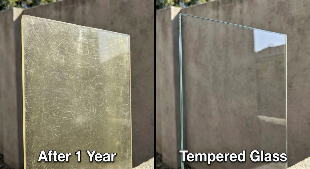 结论: 在高频接触的区域(如桌面、柜台挡板、门窗),塑料通常在2-3年后就需要抛光或更换,而玻璃使用10年后依然光亮如新。